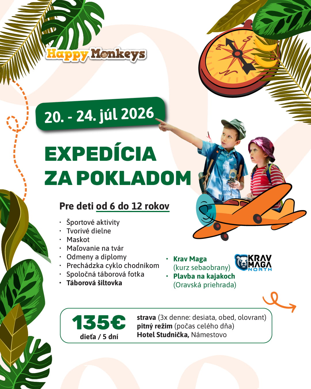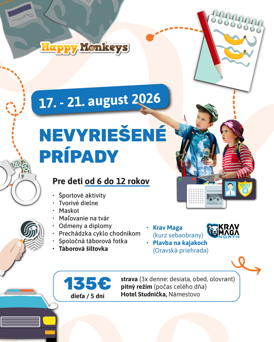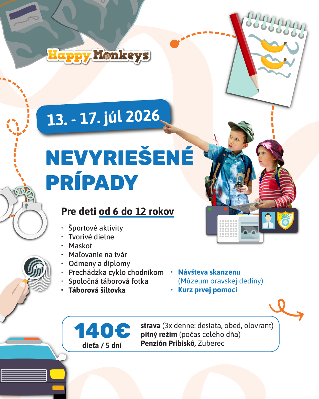 Denné tábory s Happy Mokeys 2026 Aktuálna ponuka Hotel Studnička NÁMESTOVO Penzión Pribiskô ZUBEREC Stačí pár klikov Prihláška Vyplňte formulár a my vám prihlášku zašleme rovno do vašej e-mailovej schránky. Please enable JavaScript in your browser to complete this form.Please enable JavaScript in your browser to complete this form.Meno a priezvisko *E-mailová adresa *Telefónne číslo *O ktorý z táborov máte záujem? (Vybrať môžete aj viac možností.) *13. - 17. júl 2026 (Expedícia za pokladom) - NÁMESTOVO13. - 17. júl 2026 (Nevyriešené prípady) - ZUBEREC20. - 24. júl 2026 (Expedícia za pokladom) - NÁMESTOVO17. - 21. august 2026 (Nevyriešené prípady) - NÁMESTOVOVyžiadať prihlášku Viac informácií Sales managerMaroš Vorek Telefón+421 951 245 931 Emailvorek@happymonkeys.sk